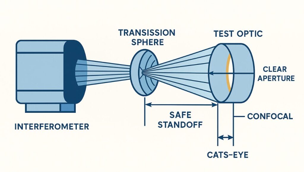 The transmission sphere is the cornerstone of accurate interferometric testing. Matching F/# and R/# ensures correct focus and coverage; verifying cat’s-eye clearance prevents collisions; and maintaining calibrated optics preserves measurement integrity. By defining “full coverage” and documenting acceptable partial or stitched configurations, technicians can make confident, repeatable measurements that meet optical metrology standards.