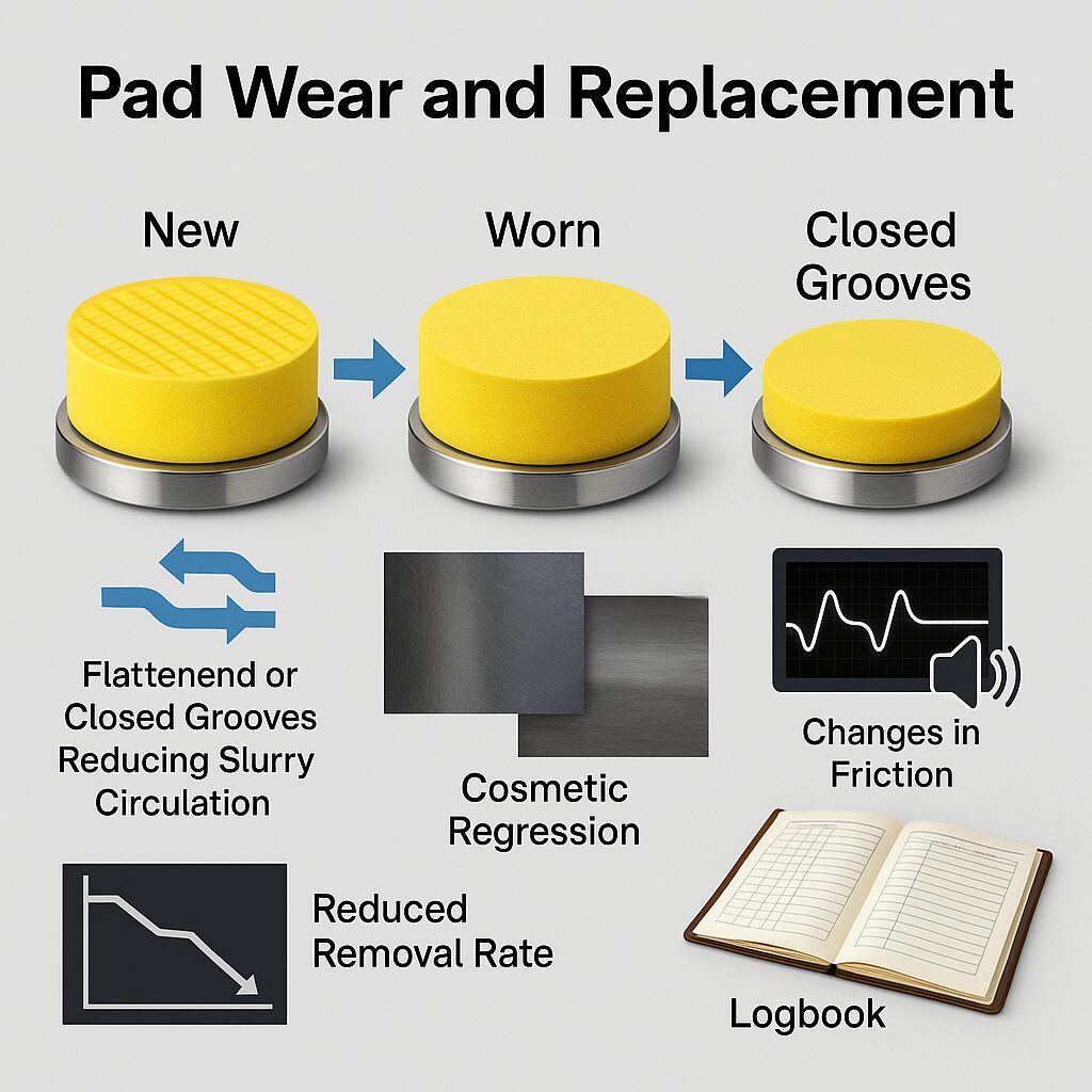 When any of these symptoms appear, the pad should be resurfaced or replaced to restore stable, predictable polishing behavior. Proper recordkeeping of pad lot numbers, hours of use, and performance metrics ensures traceability and supports process repeatability.