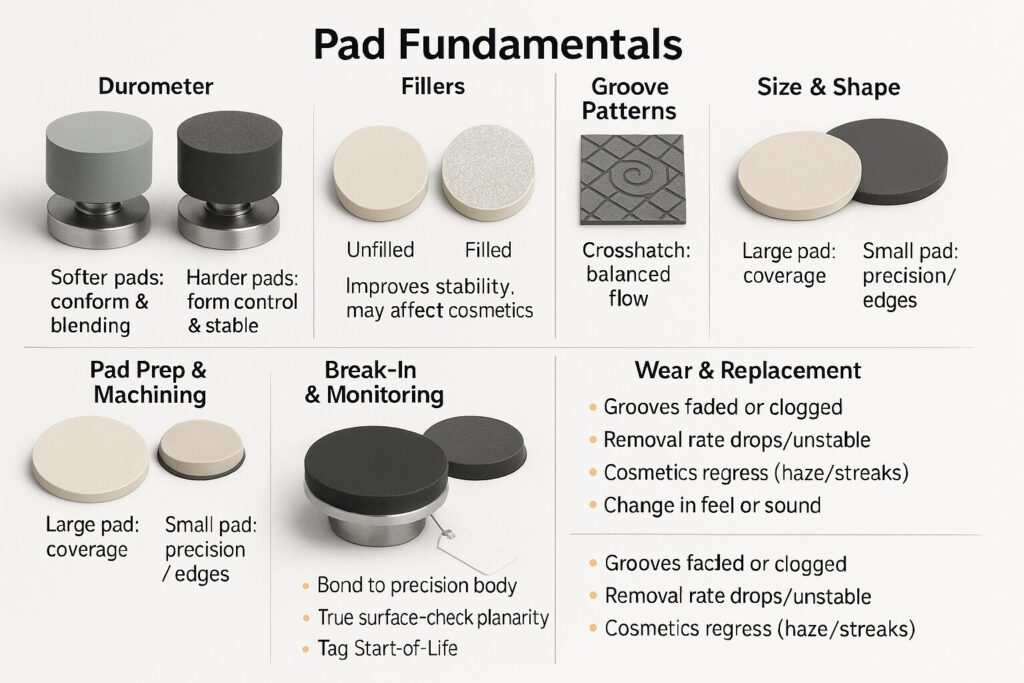 Choosing the right pad depends on the balance between removal rate, form accuracy, and surface cosmetics. Several physical properties guide this selection: