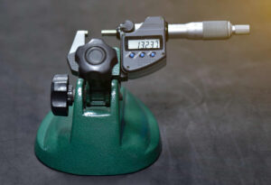 Micrometers trade speed and versatility for precision. The anvil and spindle generate a well-controlled contact geometry, and the ratchet or friction thimble enforces repeatable measuring force. With good technique and a clean part, you can routinely achieve readings to 0.001 mm, and on a well-kept instrument even better. Because the contact line is narrow, alignment matters: any tilt between the micrometer and the part introduces cosine error and false “tight” readings. Roll the part gently between anvil and spindle while you close with the ratchet; feel for the moment of tangency and stop at the first consistent click sequence. If a value drifts as you keep clicking, you’re deflecting the part or the frame—back off and re-seat. There are specialty micrometers for unique applications. Use Micrometer stands to hold the instrument if needed to ensure safety of the optic and the micrometer.