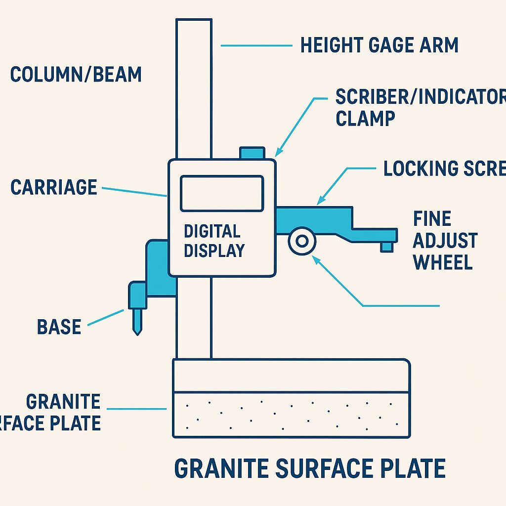A height gage is a precise vertical measuring tool that slides on a granite surface plate. With a scribe or an indicator tip, it determines how tall something is, how deep a feature goes, or how much a surface sags from a flat reference. Treat the surface plate as perfectly flat ground and the height gage as a smooth-gliding measuring tower.