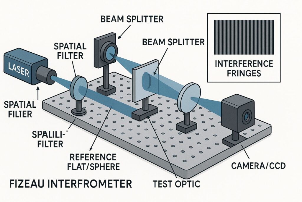 Interferometers are instruments that measure how smooth and accurate an optical surface is by using light waves. They compare the light reflected from a “reference” surface, something we trust to be very accurate, to the light reflected from the surface we are testing. The pattern made by the overlapping waves is called an interference pattern, and it tells us if the test surface is flat, too curved, or has tiny bumps and valleys. A transmission sphere (for testing curved surfaces) or a transmission flat (for testing flat surfaces) acts like the high-precision ruler in this setup. It shapes the interferometer’s beam so that it matches what the test surface should look like if it were perfect. When the test surface is exactly the right shape, the light comes back as expected and the interference pattern looks simple and straight. When it isn’t, the pattern bends, twists, or shows rings that we can measure.