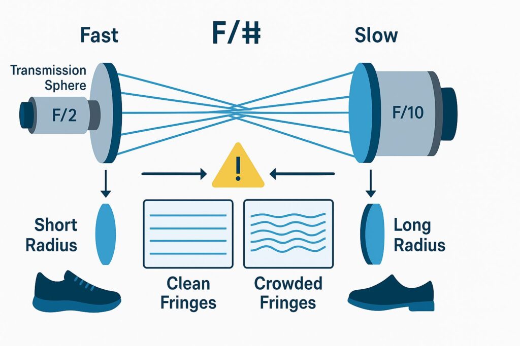 Think of it like trying on shoes. If your foot is very curved (short radius), you need a shoe that curves more (fast sphere). If your foot is barely curved (long radius), you need a shoe that curves less (slow sphere). When the F/# matches the lens’s design, the interferometer sends the right wavefront to the test surface and gets a clean, meaningful pattern back.