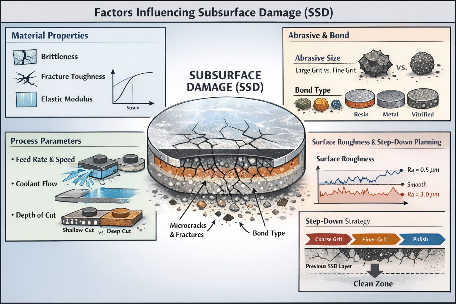| Surface Microroughness (Ra, Rz) | Coarser finish = deeper subsurface cracks Smoother finish = shallower SSD |