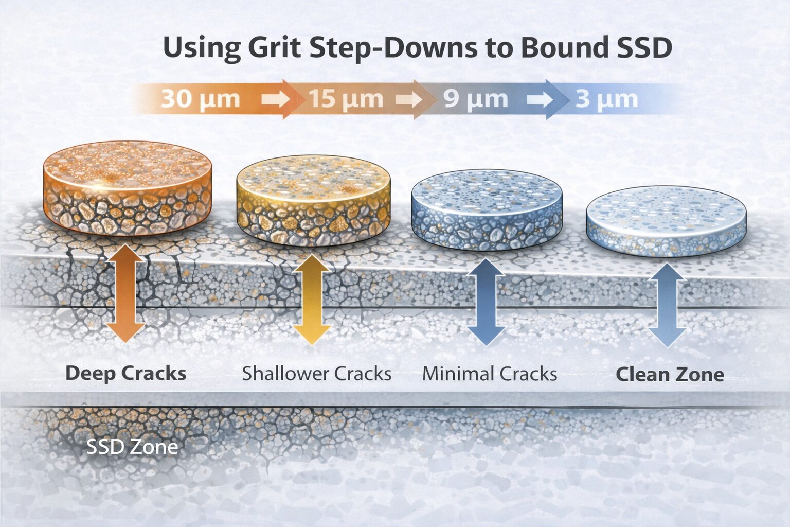 | Grit Step-Downs | Each grit step must remove prior SSD with margin. | Plan grit ladders (e.g., 30-15-9-3 µm) for balanced cycle times. |