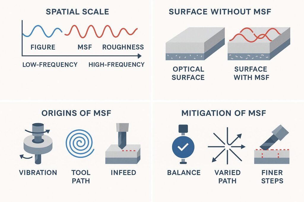MSF describes surface patterns that occupy the space between fine roughness and large-scale figure errors. They often appear as periodic waviness that traces back to the mechanics of fabrication. Machine vibrations, spindle imbalance, cutter frequency, and deterministic tool paths all leave their imprint in this regime. Unlike SSD, which hides below the surface, MSF sits at the surface itself, where it interacts directly with light. Even a well-controlled SSD profile cannot protect against the scattering, diffraction, and wavefront distortion introduced by MSF. For high-performance optics, such as laser components and imaging systems, this loss of contrast and increase in stray light can be system-limiting.